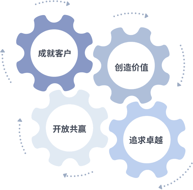 成就客户是一切决策的出发点,,,,创造价值是衡量所有工作的标准,,,,追求卓越是我们做事做人的态度,,,开放共赢是我们的格局也是最终的结果。。。。价值观的齿轮环环相扣,,,推动着组织里的每个人不断向前。。。