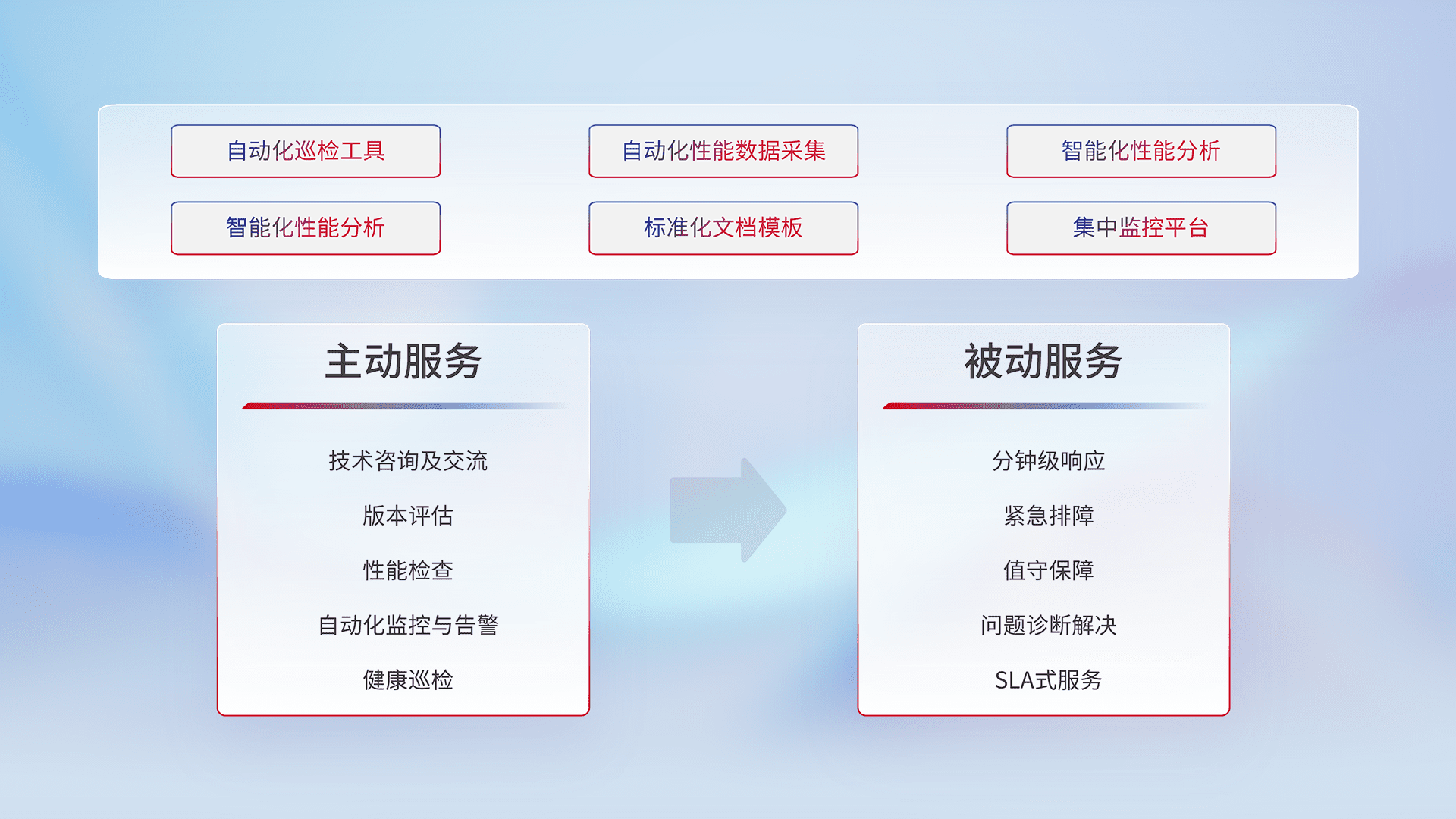 智能化工具和标准化文档,,,,保障服务质量,,,提供主动服务(包含技术咨询、、、、版本评估、、、、性能检查、、、自动化监控与告警、、、、健康巡检)和被动服务包含(分钟级响应、、、、紧急排障、、值守保障、、、、问题诊断解决、、SLA服务)。。。